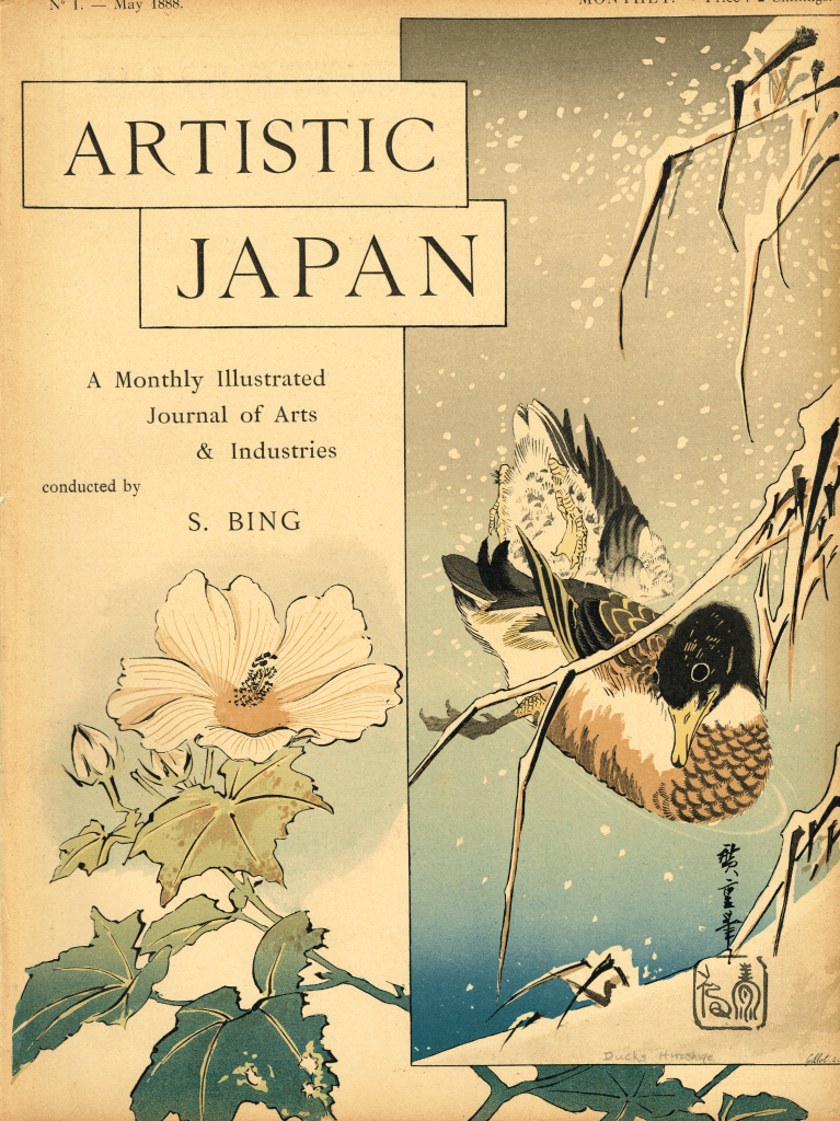All forms of Art Nouveau/Jugendstil, the German term for the New Art, owe a debt to Japanese prints. Designers either tried to capture the spirit of Japanese design, its minimalism and linearity, or appropriated indicative motifs. Bamboo, cranes, fans, carp, and patterns derived from silk kimonos popped up on ceramics, metalwork, and textiles. Underpinning the Aesthetic Movement (c.1860-90), by the 1880s Japonisme had become a fashionable craze and households were bedecked with Japanese paper fans and blue and white china. Samuel Bing’s journal Le Japon Artistique (1888-91) covered every aspect of Japanese art, providing a lexicon of designs.