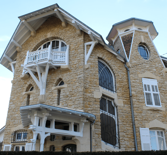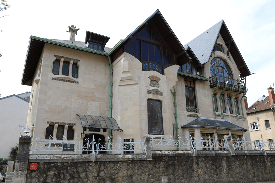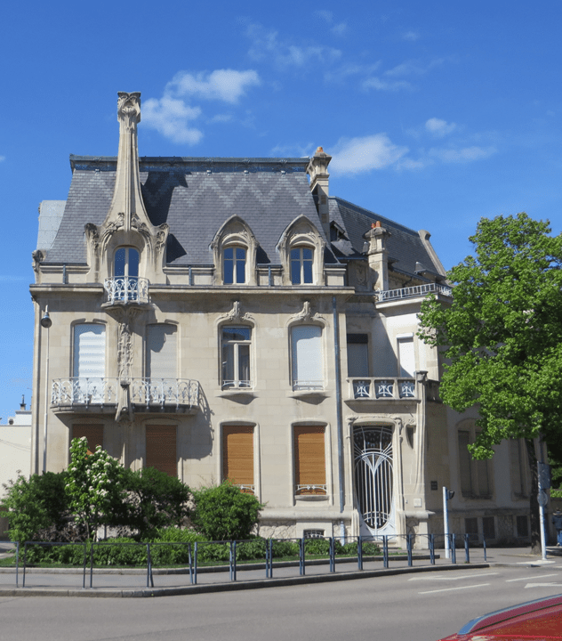 The only architect of national stature to work in Nancy was the Parisian Henri Sauvage, who designed the Villa Majorelle or Villa Jika (1898-1901). This building was to have a profound influence on Nancy’s local architects: Lucien Weissenburger (1860-1929); Eugene Vallin (1856-1922); George Biet (1868-1955); Henri Gutton (1851-1933) and Emil Andre (1871-1933) forged their own distinctive florale architectural style. They blended a variety of sources both historic and modern. Gothic elements, towers and turrets, sit alongside Rococo naturalist motifs. Roof lines were enhanced with a fleuron, a flower-shaped finial or pinnacle. Purely decorative, a fleuron implied the building was organically growing from ‘earth to sky’. With their mansard roofs, some of the large villas recall the splendours of the Chateau of the Loire. Paul Charbonnier’s grandiose house for Paul Jacques (1905-06), avenue Foch, and Léon Cayotte’s Villa Frühinsholz, avenue du Général-Leclerc, exemplify the ambitions of Nancy’s bourgeoise.