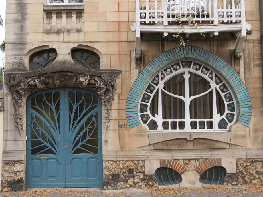 Émile Andre’s Huot House (1903), on the Quai Claude Le Lorrain, dominated by its peacock-eye window framed with turquoise tiles, certainly makes a statement. Seen from an incoming train, the façade was not only an advert for Andre’s style florale, it also proclaimed the city’s commitment to modernity. This semi-detached house uses a multiplicity of materials: rocky limestone, cut stone, ceramics, wood, metalwork, and stained glass. Yet the overall effect of the picturesque composition is unity.